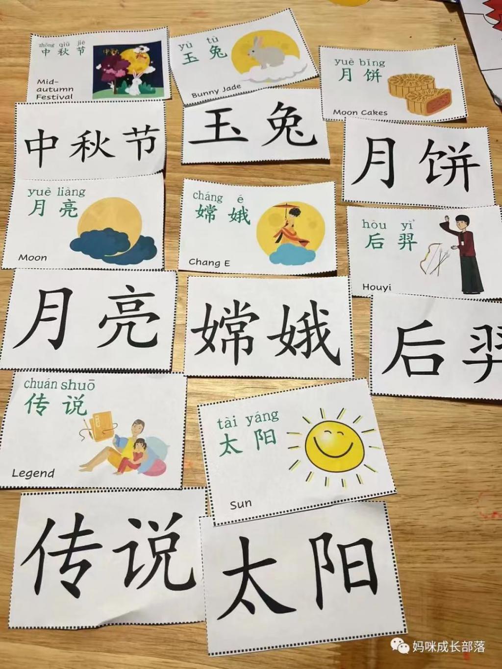 关于中秋节的中英文闪卡也可以准备起来,带学生们玩“词语躲猫猫”的游戏:把词卡藏在不同位置,再让学生把对应的词汇找出来。