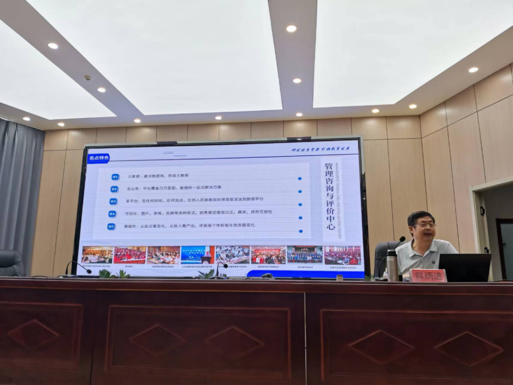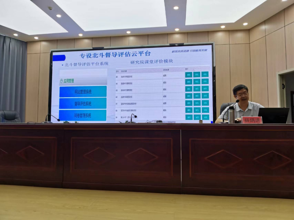 薛炳进首先介绍了依托北斗教育研究院网站,专设督导评估云平台,设立8大模块信息化督评平台、依靠研究院信息化中心及时提供智能服务的做法。