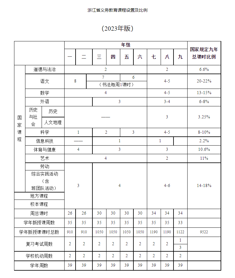 附件:浙江省义务教育课程设置及比例(2023年版)
