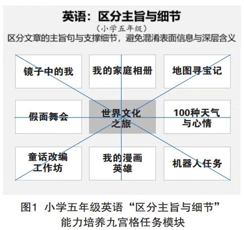 以小学五年级英语“区分主旨与细节”能力培养为例(图1),我们设计了九宫格任务模块:中间“世界文化之旅”为必选,学生需选择一条直线上的三个模块(如“镜子中的我—世界文化之旅—机器人任务”),既确保能力目标全覆盖,又保留个性化路径。