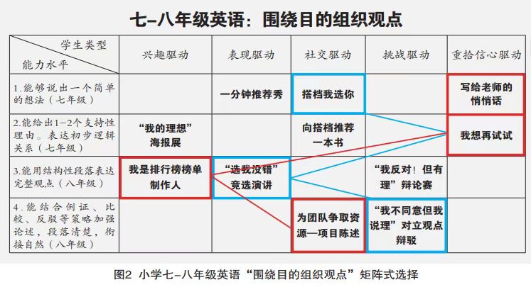 到了七—八年级,进阶为矩阵式选择(图2):11个任务按“能力水平”和“动机类型”分类,学生可像搭积木一样组合(如“为团队争取资源—项目陈述”与“‘我反对!但有理’辩论赛”组合),形成其专属学习路径。