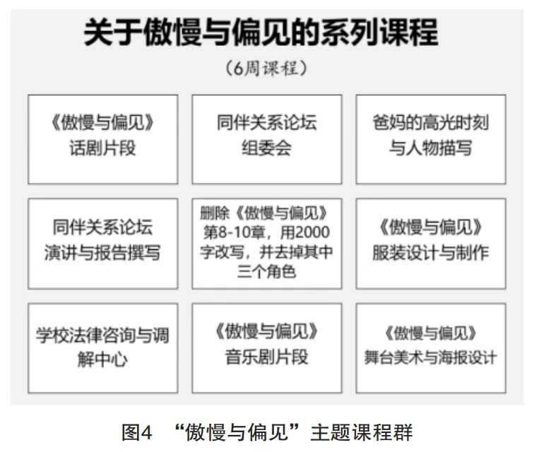 七、八年级,是青春期学生滋生傲慢与偏见的敏感期。我们在七年级下学期至八年级设计了“傲慢与偏见”主题课程群(图4),包含9个模块(如“跨文化沟通中的偏见”“媒体报道的客观性分析”等),学生需从中选择2个(中心模块为必选)。无论选择哪两个,都能覆盖图5中的素养——正如我们常说的“不育人,无法教书。”每个学科的知识点,都应成为素养生长的土壤。